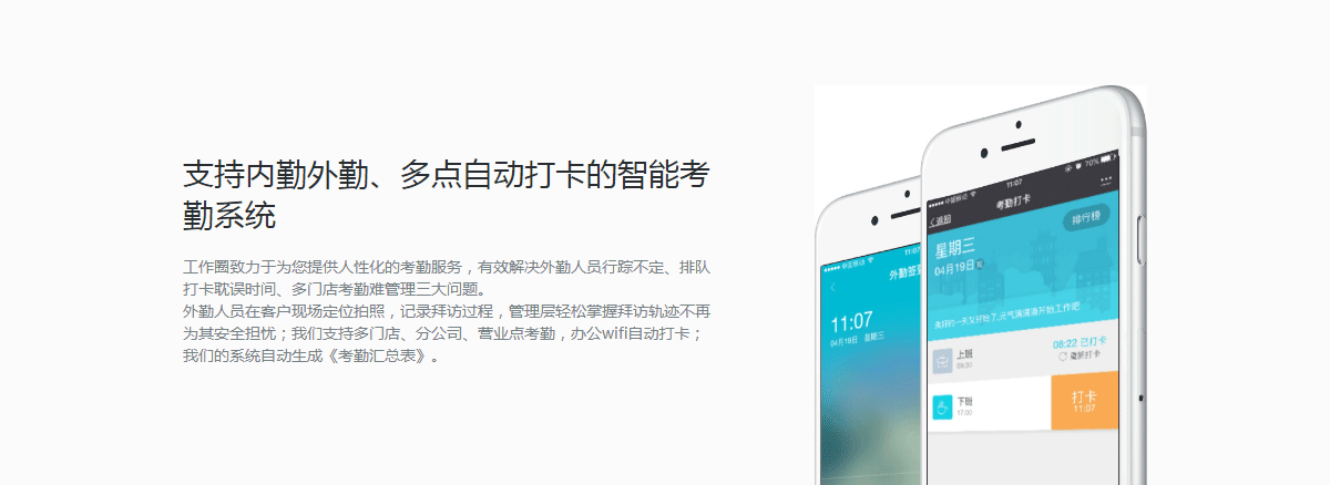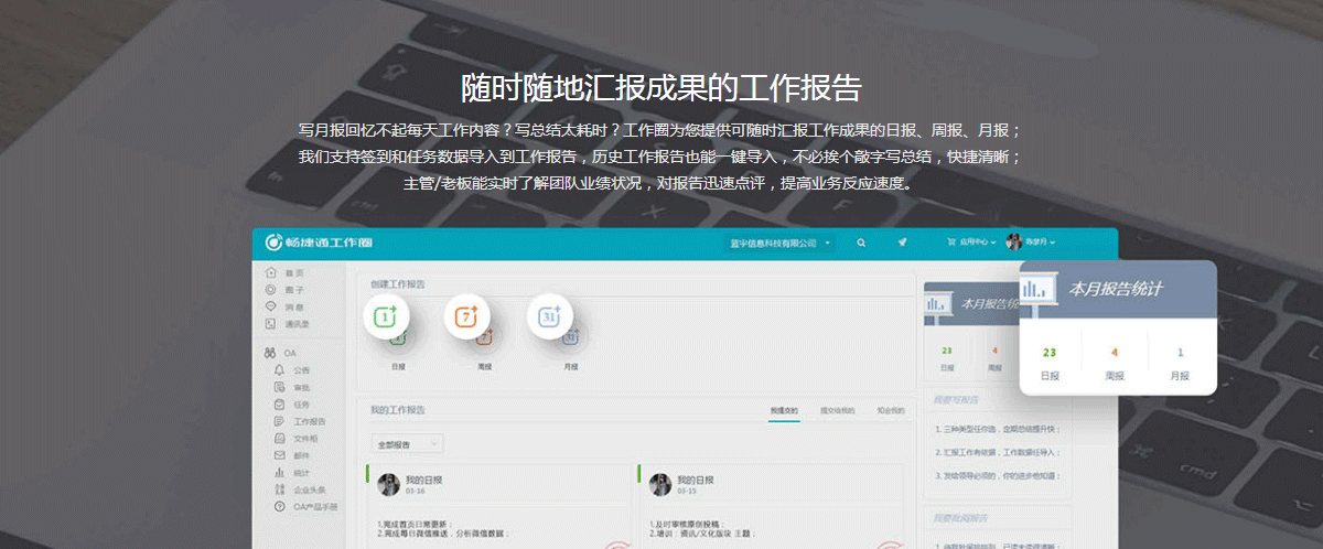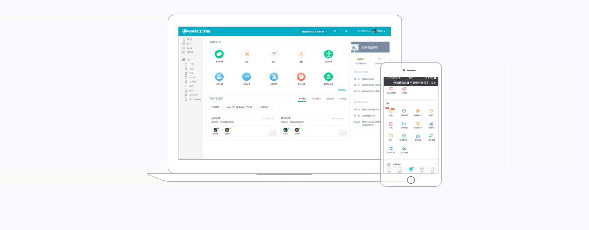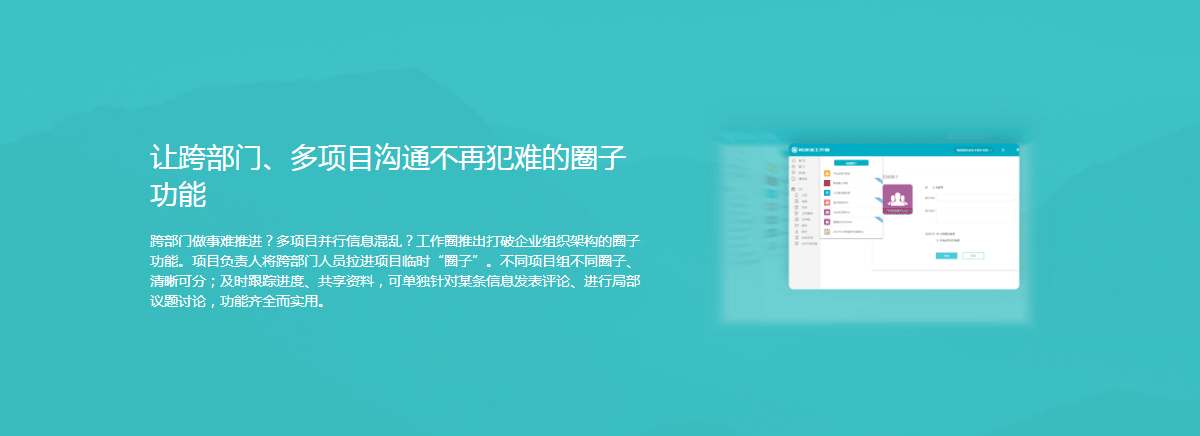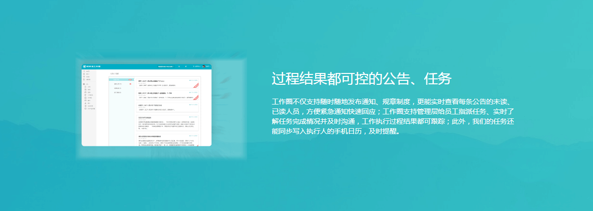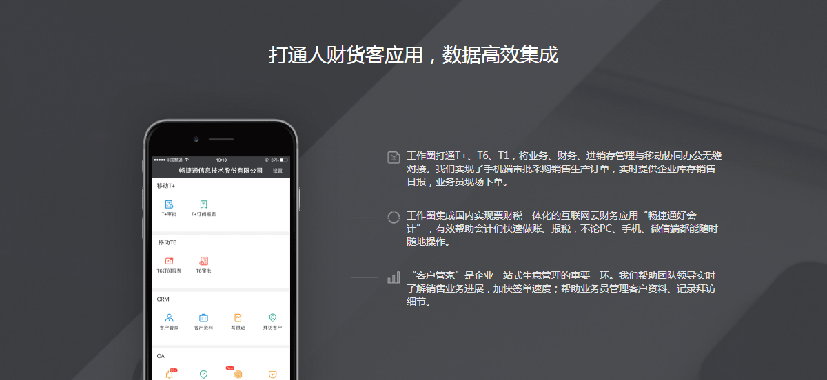 工作圈融合了企业在人、财、货、客等方面管理需求,包括日常审批、工作报告、外勤打卡、签到考勤、公告、任务、电话会议等,同时整合了专业的ERP、CRM、财务等应用,帮助企业提高协作效率、简化工作流程、降低管理成本。